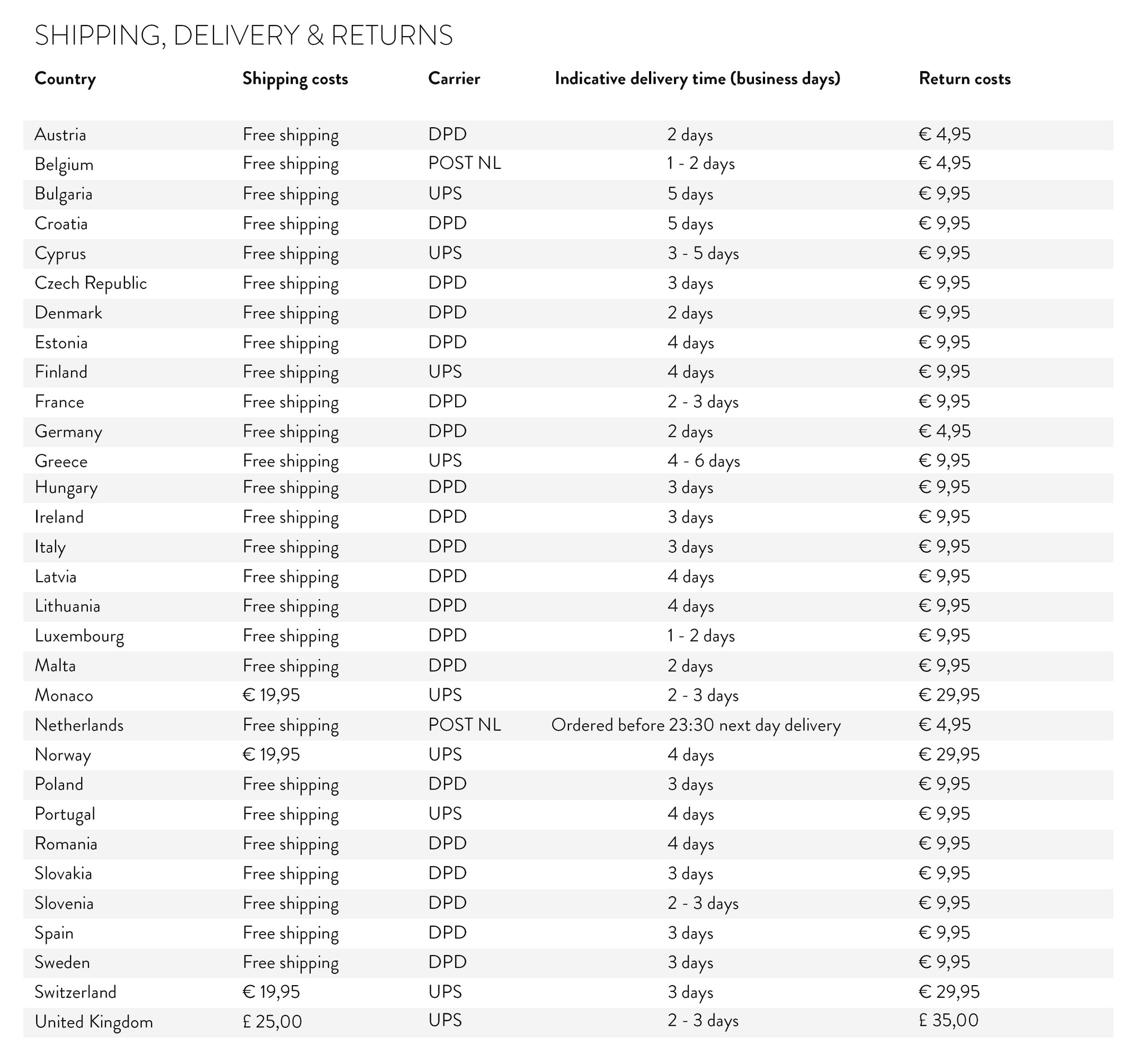 Below is an overview of our international shipping rates and estimated delivery times. We work with DPD.
