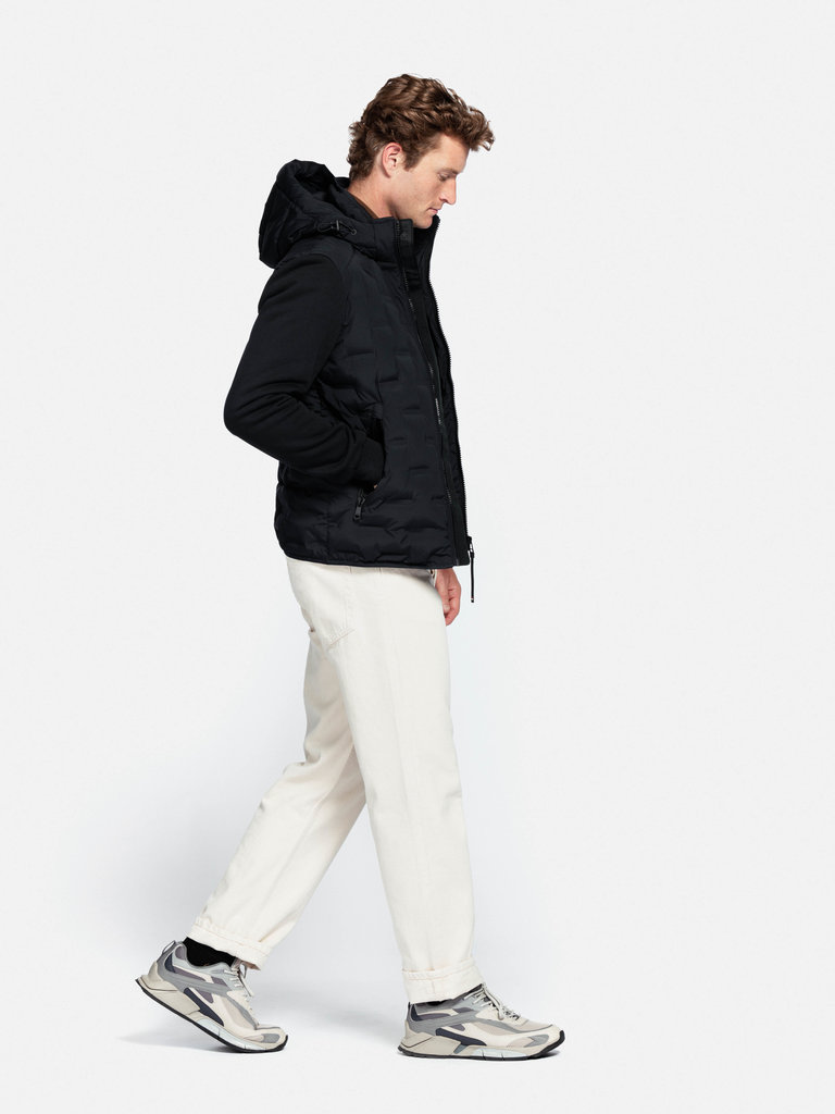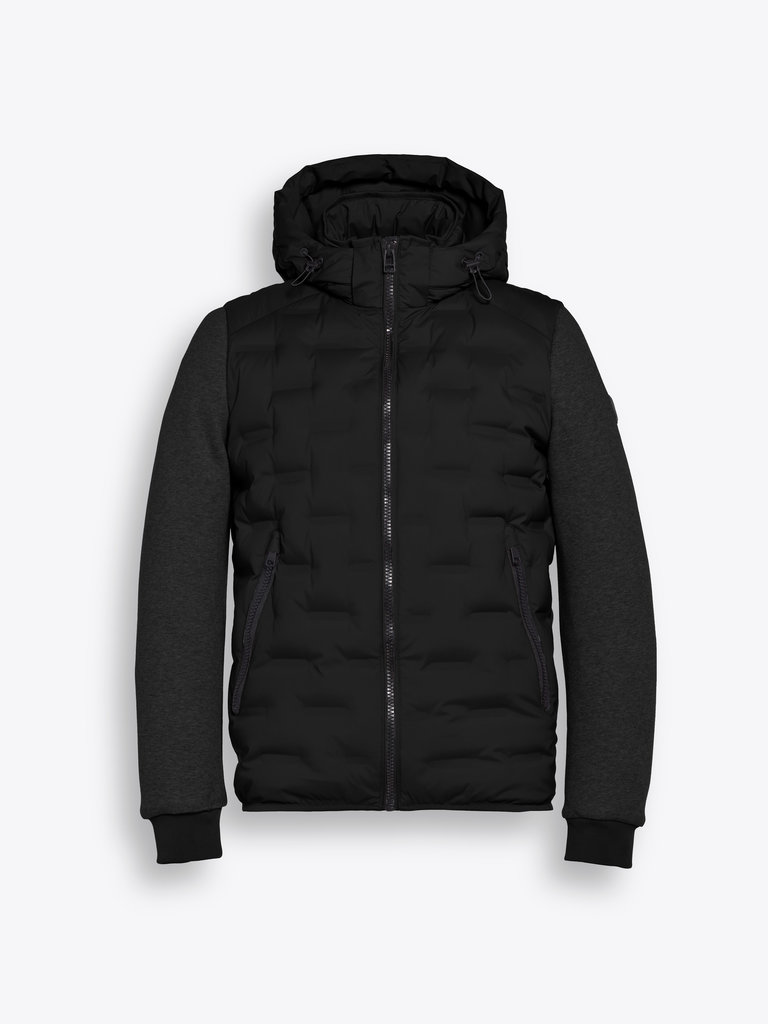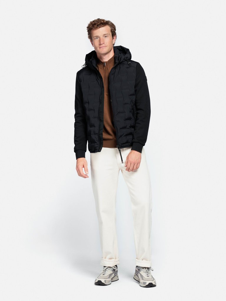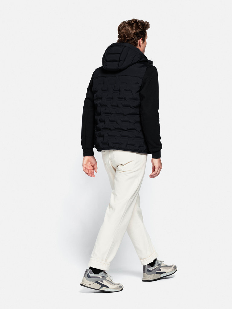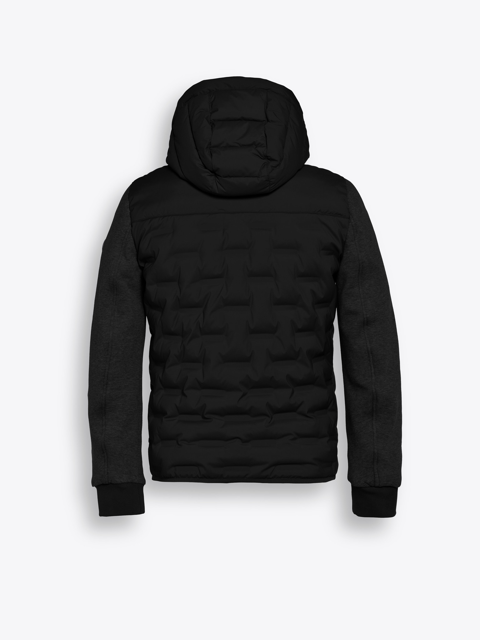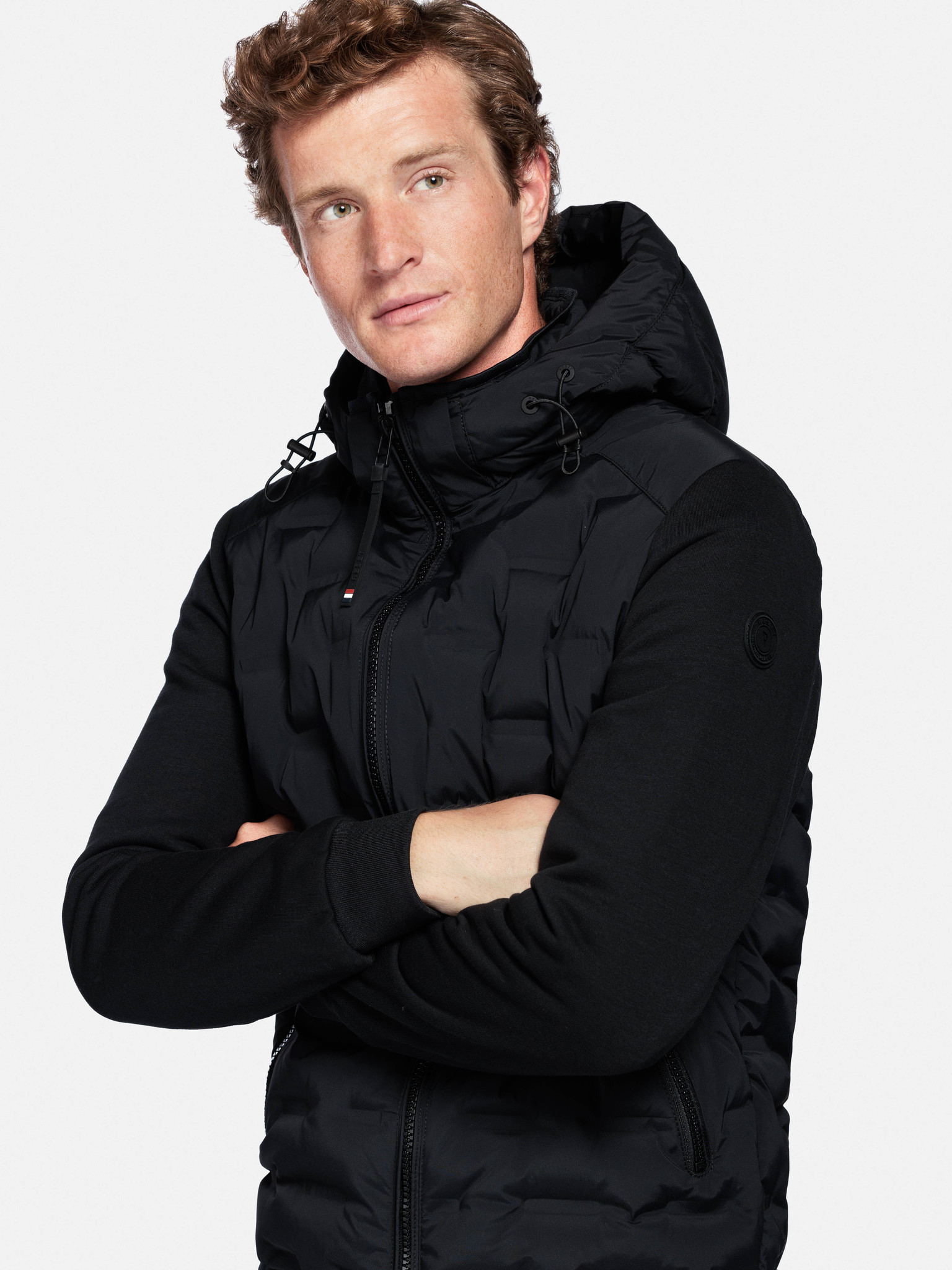 Jack in materiaal mix van gefusede stretch polyamide met jersey mouwen. Relaxed fit, opstaande kraag met een blinde rits, afneembare capuchon, 2 rits zakken, gebreide tailleband en badge met logo op de mouw. Een sportief maar opvallend model dat perfect is voor de herfst en zachte winter.